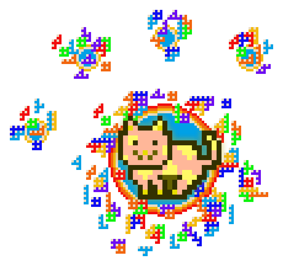 This MoonCat’s litter (MoonCats who share the exact same yellow color (in the 57° hue range) and pattern) has 3 MoonCats in it: